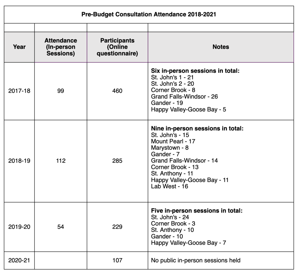 Opening pre-budget submissions earlier, however, doesn’t mean residents have had more time. In 2022, the government gave the public 17 days to complete the pre-budget questionnaire on its EngageNL website, which garnered 247 responses. In 2023, the window was opened for just 17 days again, generating 374 questionnaire submissions. In 2024, residents had 18 days and it’s unclear how many submissions were received.