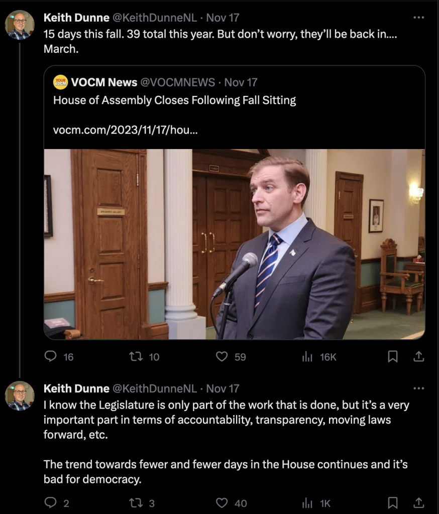 The Newfoundland and Labrador House of Assembly’s fall sitting wrapped on Thursday, which means the legislature sat for a total of 15 days this fall, and just 39 days in all of 2023. MHAs will reconvene in March, 105 days from now.