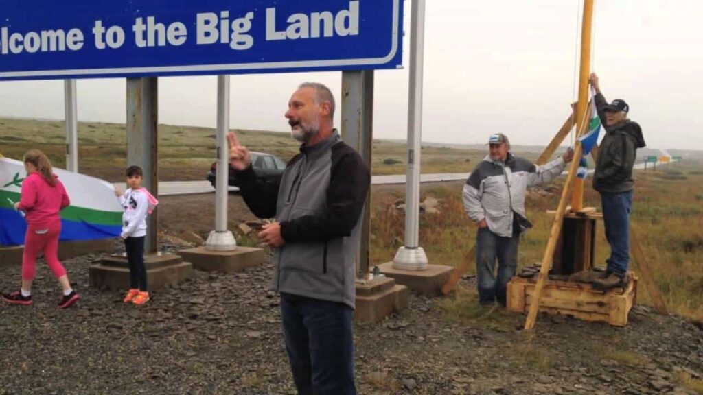 It was early morning when Jim Learning picked me up in Happy Valley-Goose Bay. Atop his old pickup truck was a beautifully crafted 30-foot Labrador Spruce flagpole, cut and prepared with pride and care, fastened tightly on a brace made especially for the occasion. Another vehicle joined with more passengers (Edward Mesher, Jim Purdy, and Jacinda Beals) and the excitement was palpable as we knew this was a historic journey. There was a power felt that day as we drove down the Trans-Labrador Highway, and that feeling grew the closer we got to the southern border. Everything synchronized perfectly upon our arrival at the border. We had exactly enough concrete, water, and materials to set the massive flagpole into its place in history. A few days prior two sons of Labrador hung the Labrador flag off the side of one of the steel flagpoles already bearing other flags being recognized at the site behind the “Welcome to the Big Land” sign. This flag was removed and called an act of vandalism, an insult that stuck with us as we worked with great purpose.