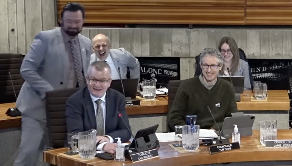 “Coun. Korab is Leaving Quietly,” O’Leary joked as Korab, attempting to slip out discreetly, ended up doing the opposite. Brushing past the table on his way out, he inadvertently swiped City Manager Kevin Breen’s metal name plate right off the table after which, much to everyone’s amusement, landed on the floor with a loud clang.