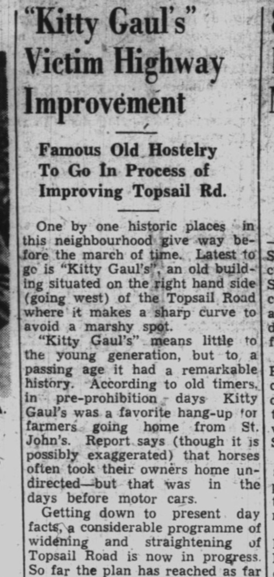 Fun fact: the namesake of that stream and the adjacent Kitty Gaul Park, used to run a public house in the pre-prohibition days. Kitty Gaul’s was the first stop on a longer pub crawl for people making their way back to Topsail from St. John’s. In 1945 it too was deemed a casualty of development. The Daily News called it a “victim of highway improvement” when it was torn down as part of the widening and straightening of Topsail Road.