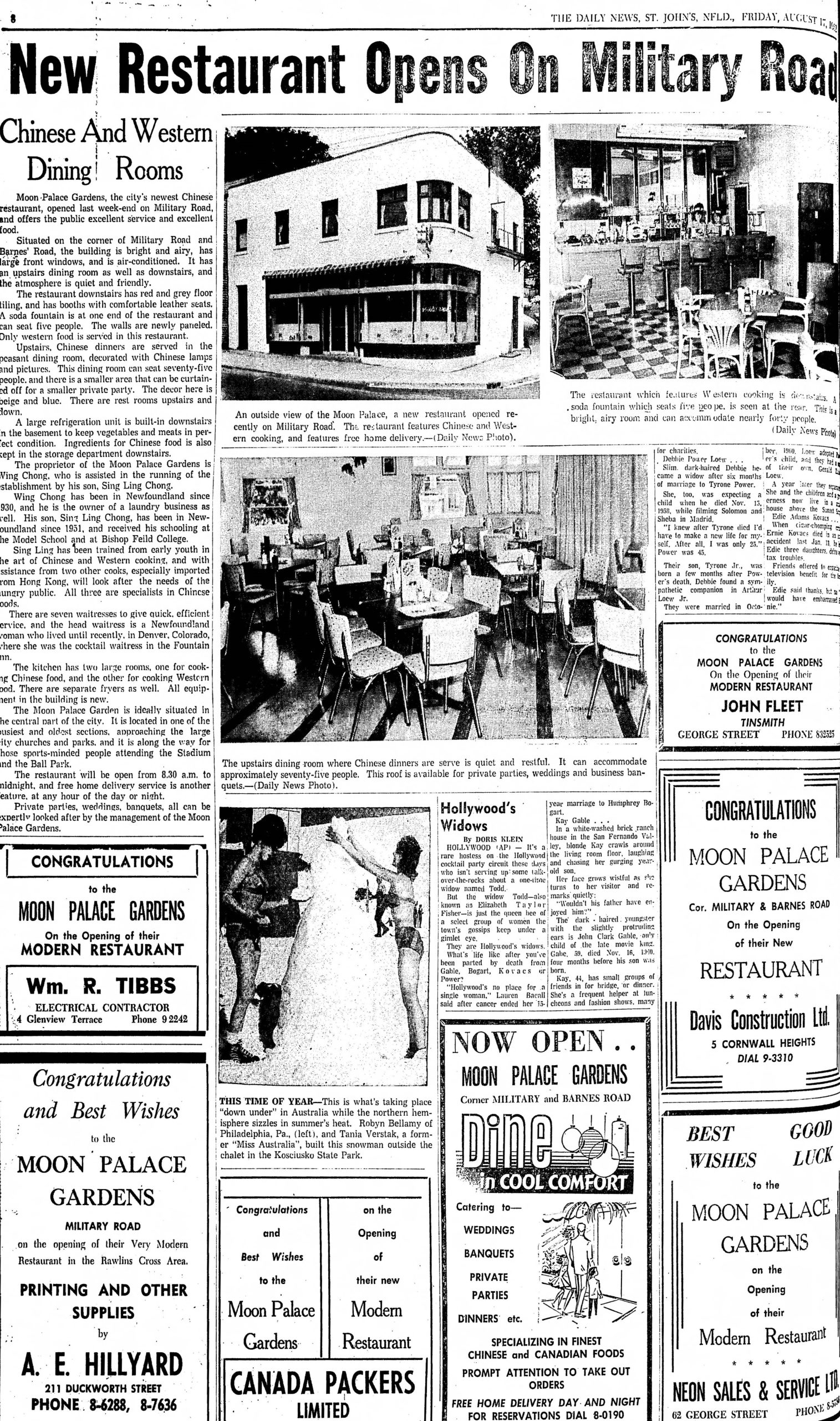 A couple of weeks ago, in the spirit of February being heritage month, I was perusing old editions of the Daily News when I stumbled upon a piece about the opening of Moon Palace Gardens on Military Rd., from the summer of 1962. I was struck, not so much by the half-page article, but the ads that filled up the rest of the page. All placed by local businesses, they welcomed the new restaurant to the neighborhood, congratulated them on their new venture, and wished them well.