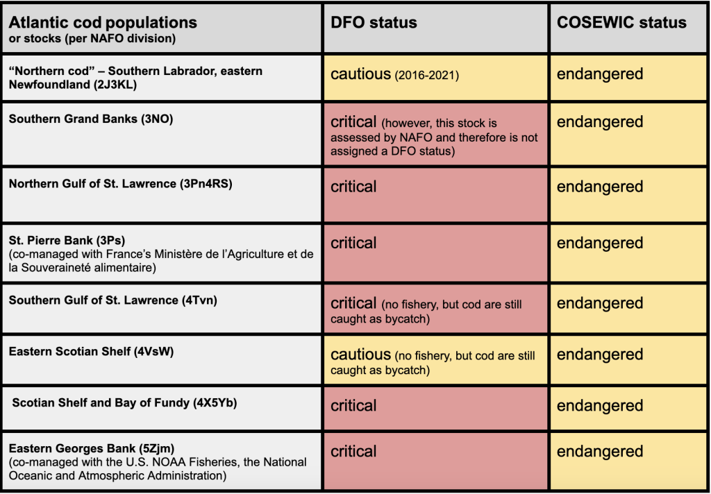 In addition, the Committee on the Status of Endangered Wildlife in Canada (COSEWIC), an independent body that makes recommendations to the federal government about species at risk listings, has found all eight Atlantic cod populations are endangered. Endangered is one of the committee’s four risk categories (endangered, threatened, special concern, or extirpated, meaning locally extinct) and means a species is in danger of extinction throughout all or a significant portion of its geographic range.