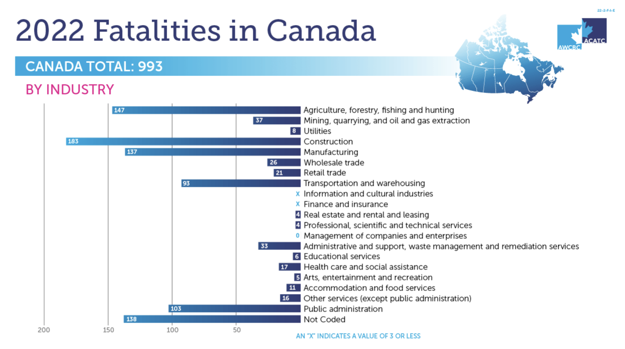 According to the National Work Injury/Disease Statistics Program (NWISP), which is run by the Association of Workers’ Compensation Boards of Canada, of the 993 workplace fatalities in Canada in 2022, construction topped the list with 183 deaths, followed by agriculture, forestry, fishing and hunting, accounting for 147 deaths. Manufacturing accounted for 137 deaths. (See Figure 2).