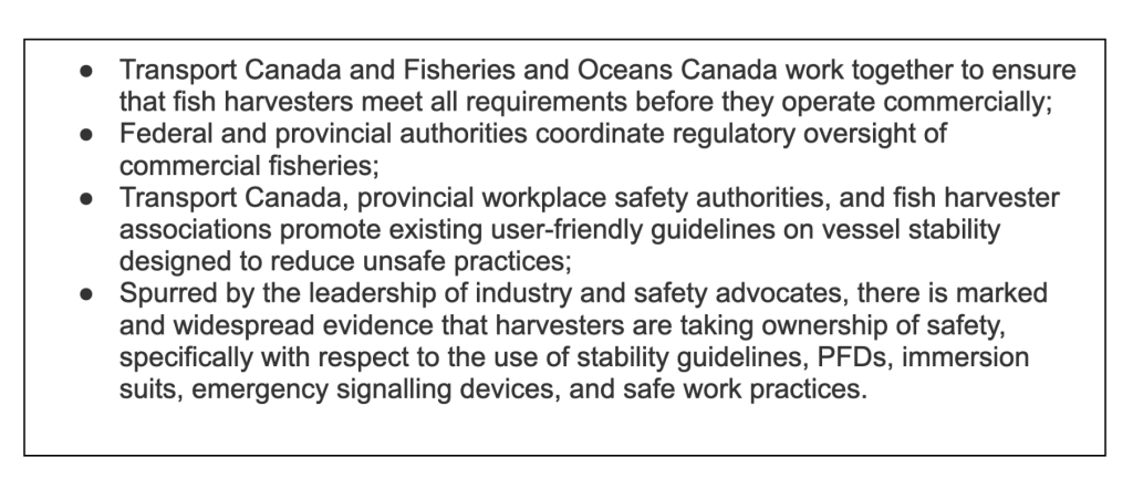 “Overall, it appears that fish harvesters are aware of the existence of the new regulations, but not all are aware of the detailed requirements,” the TSB reports.