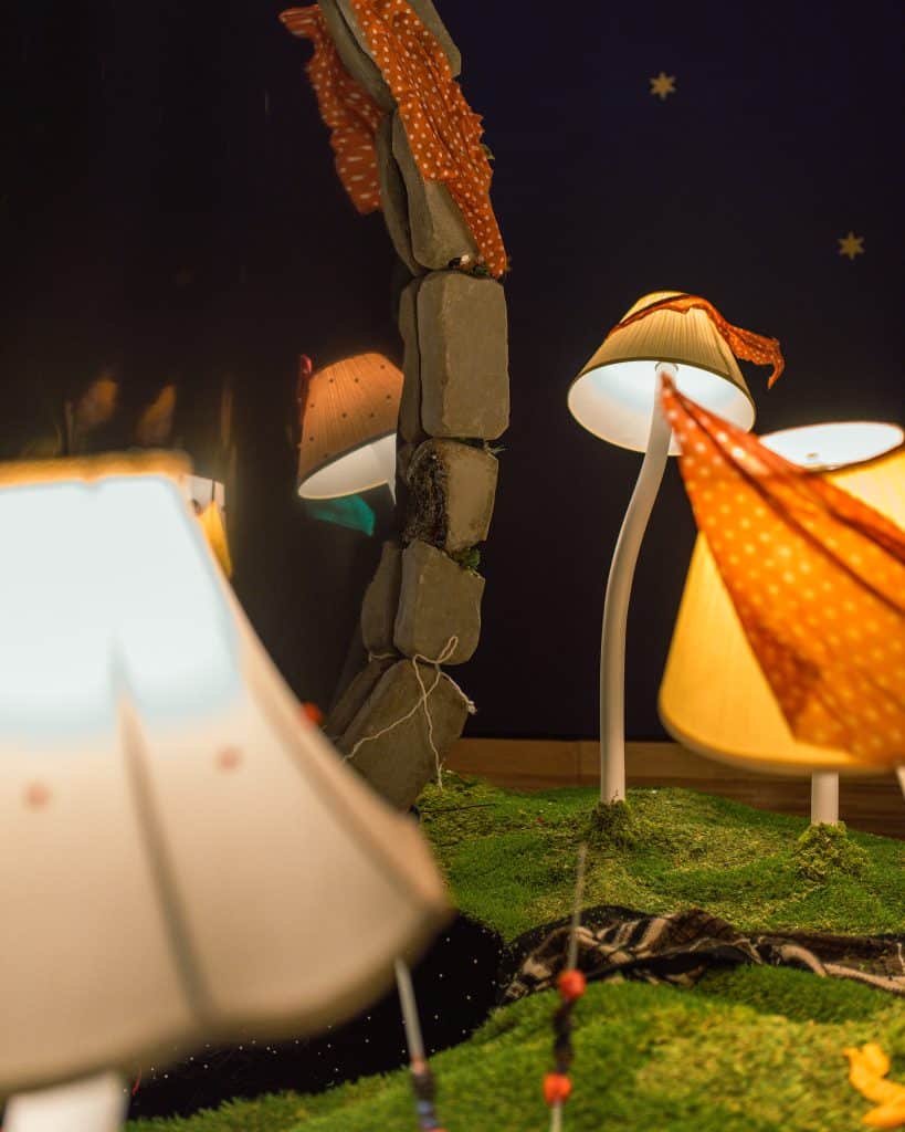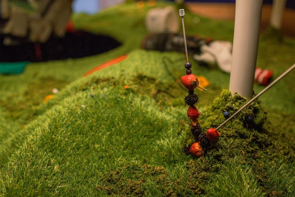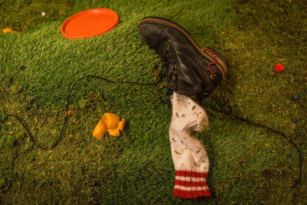 Things like skewers of berries on knitting needles, that was actually plucked from a story that was included in Barbara Rieti’s book Strange Terrain. And then there’s elements of clothing, and those are my clothing. I sacrificed my favourite sweater, and the socks over here were knit by my Aunt Therese.