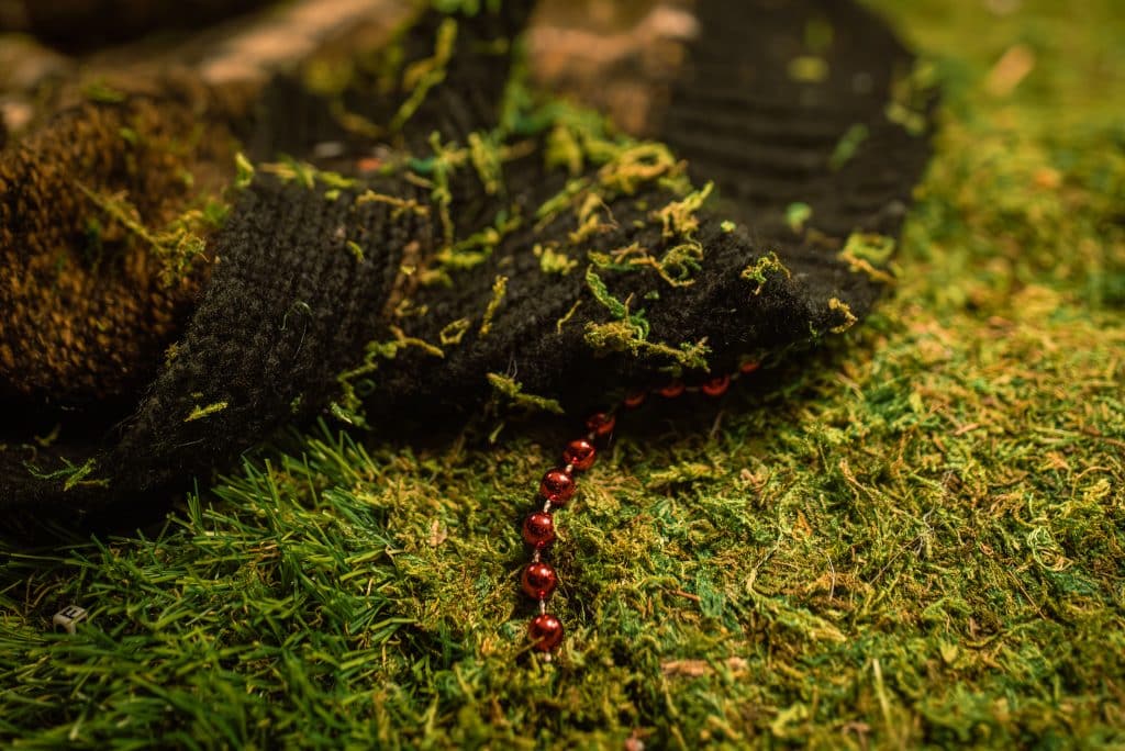 NICHOLAS AIDEN: Yes. So hidden in the grass are these red beads. Those red beads are from my Aunt Leslie’s Christmas tree. She passed away when I was in Grade 8, but growing up she lived downstairs. She was like my Mom #2. She was very encouraging of all my creativity but also she took photography lessons when I was in Grade 5. She sometimes would take pictures of me as she was trying to learn. And I’ll never forget how I saw a photo she took of me, and I just didn’t know who that person was! I was like – Who is this? This was me – allegedly – but I didn’t feel connected to that. There was this moment where I couldn’t recognize myself. I think it’s because I hadn’t found myself.
