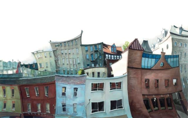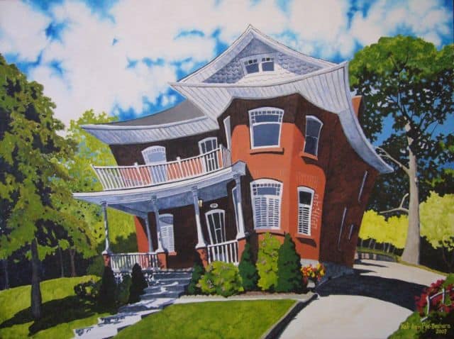 Recently, Pye-Beshara has been taking a break from canvas (“I never really loved canvas….[and] I was tired of squares and rectangles”). After a dalliance with paper, she’s been working on large scale plywood cut-outs (stay tuned for these new pieces Thursdays this month) — a perfect medium for her squirrely sense of geometry. They look a bit like very detailed pieces of dramatic set, and Pye-Beshara is thrilled. She’ll still do houses on commission, sure, but it’s with the cut-outs that Pye-Beshara sees a solidification of her artistic vision.