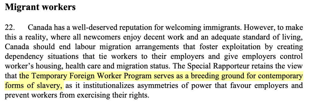 The UN’s Special Rapporteur on contemporary forms of slavery, including its causes and consequences, Tomoya Obokata, visited Canada in 2023 and notes that workers fearing deportation choose to stay with exploitative employers and work under unsafe conditions.