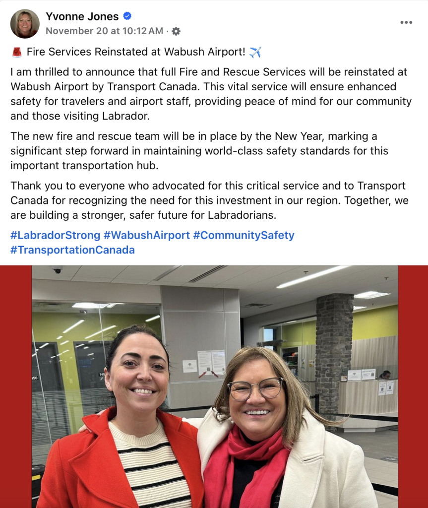 “I am thrilled to announce that full Fire and Rescue Services will be reinstated at Wabush Airport by Transport Canada,” Jones wrote in a Nov. 20 Facebook post. “This vital service will ensure enhanced safety for travelers and airport staff, providing peace of mind for our community and those visiting Labrador. The new fire and rescue team will be in place by the New Year, marking a significant step forward in maintaining world-class safety standards for this important transportation hub. Thank you to everyone who advocated for this critical service and to Transport Canada for recognizing the need for this investment in our region.”