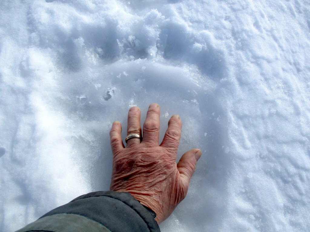 Ross Flowers of Hopedale places his hand in the footprint of a Polar Bear. Submitted.