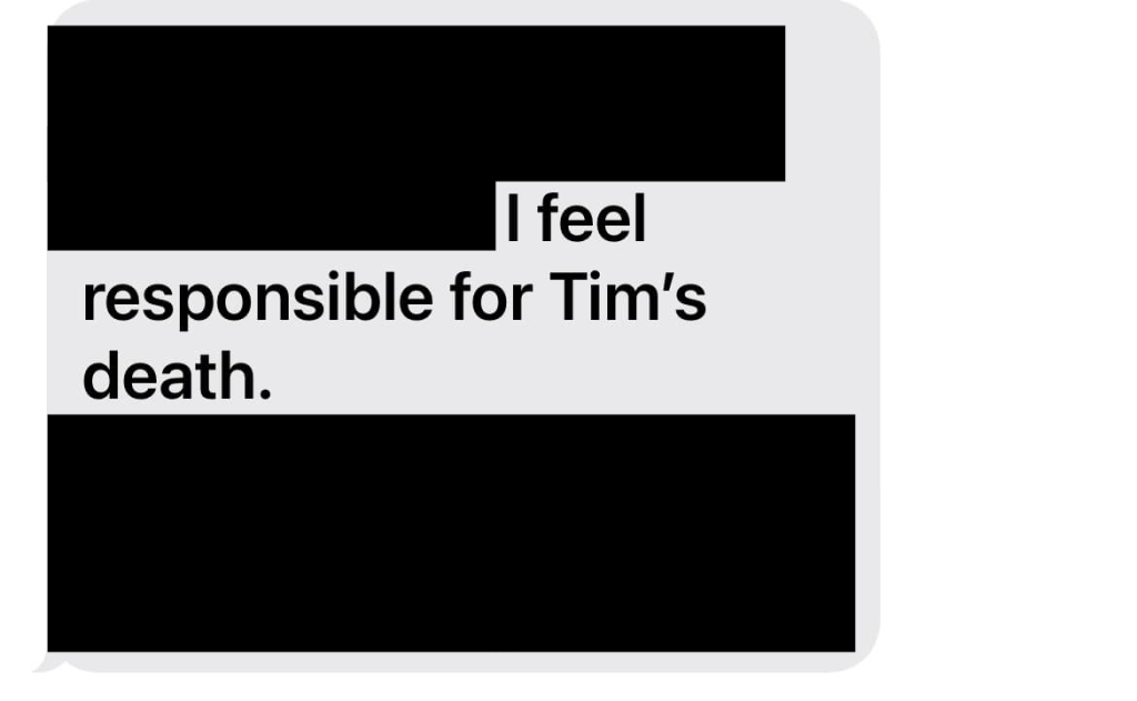 On April 8, barely more than two weeks after Tim’s death, the oncology nurse texted Susanna with what the widow believes is an admission of guilt: “I want to call you, tried several times but couldn’t do it,” the text says. “I feel responsible for Tim’s death.”