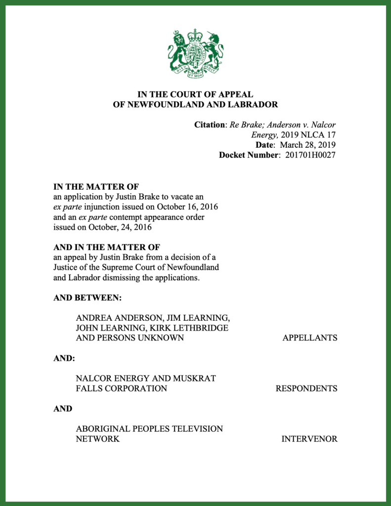 In that case, I was forced to defend my 2016 reporting from the Indigenous-led occupation of the Muskrat Falls hydroelectric project site in Labrador. After being named on a Newfoundland and Labrador Supreme Court injunction requested by the crown corporation building the dam, I was forced to end my reporting and leave the site. Despite my compliance with the order, I faced civil and criminal charges for allegedly violating the injunction.