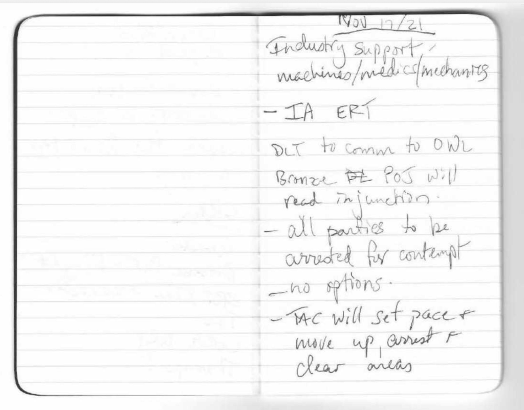 Officers involved in the operation testified that they were instructed not to take notes at the briefings. One member did, however. Of the November 17 briefing, a designated scribe named Sgt. Karen Bach wrote in a notebook entered into evidence: “All parties to be arrested for contempt. No options.” The notes also suggest members were instructed to “arrest media and bring back for [Division Liaison Team] to verify they are.”