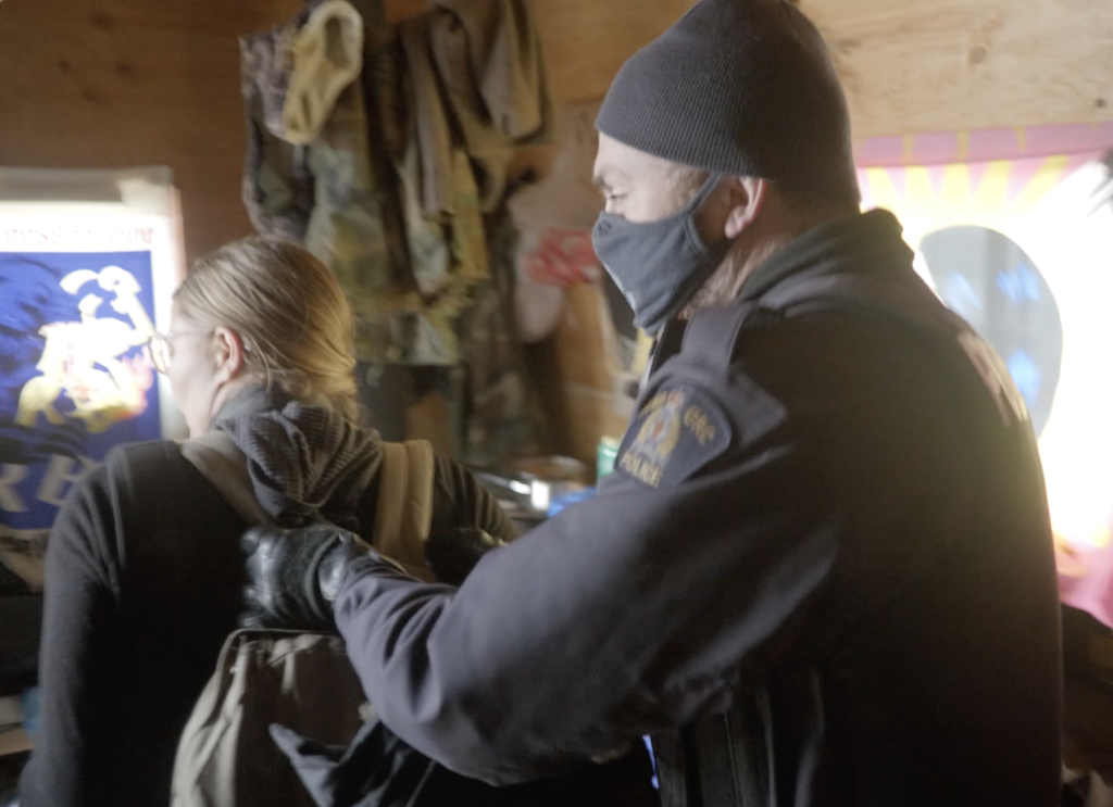 After no one inside the cabin identified themselves or came out, members of the RCMP’s Tactical Response Unit began breaking into the tiny house, first using an axe, then a chainsaw, to bust through the wooden door. A gun was then pointed through the door at the land defenders and journalists as a police dog outside can be heard barking. The dramatic scene was captured on film by Toledano. After the land defenders are removed from the structure, Carwithen, who was also responsible for Cox’s arrest, takes hold of the backpack on Bracken’s back and starts guiding her toward the door, saying “You’re under arrest.” Bracken immediately replies: “For the record, I’m a member of the media and you were notified that I’m here.”