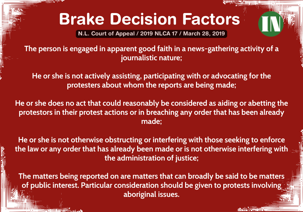 In that legal precedent, now often referred to as the ‘Brake decision,’ the province’s appeals court overturned the lower court’s decision that I had no special standing as a journalist reporting on the event. A three-judge panel declared that the presence of a journalist in an injunction zone is a “material fact” which must be disclosed to the court by a party applying for an injunction. Justice Derek Green, the authoring judge, offered a “non-exhaustive” list of factors to help determine whether a journalist’s presence constitutes a material fact. Among them is the question of whether the person in question “is engaged in apparent good faith in a news-gathering activity of a journalistic nature.” Another stipulates they don’t act in such a way “that could reasonably be considered as aiding or abetting the protestors in their protest actions.”