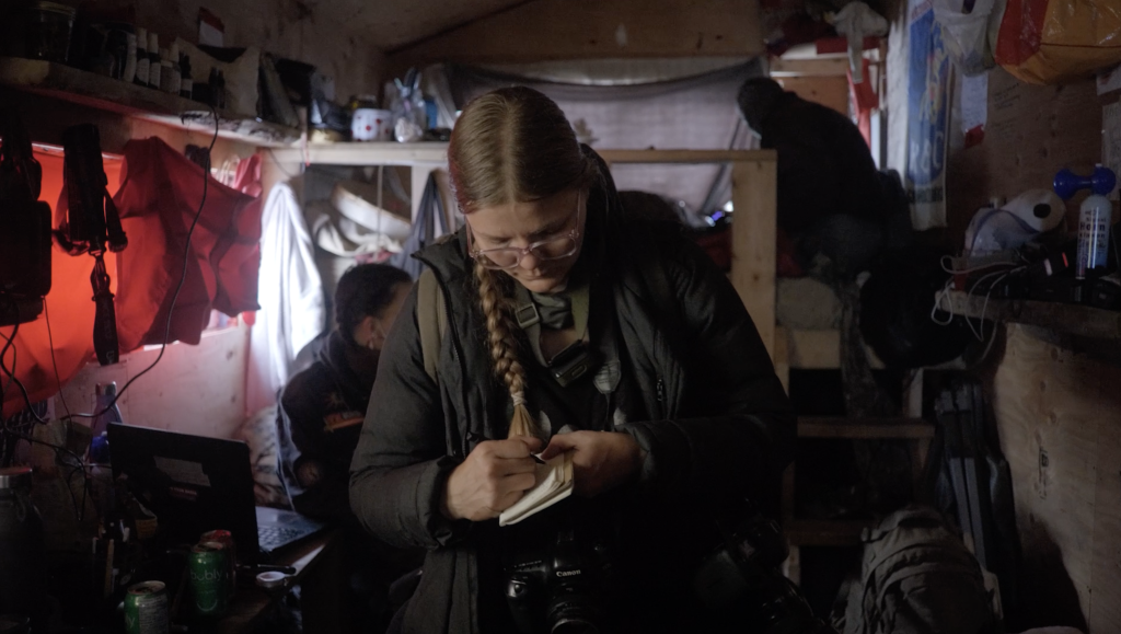 The Crown’s defence rests in part on the RCMP’s argument that Bracken “went beyond her role as a journalist,” as written in a response filed with the BC Supreme Court in October 2023. By remaining with land defenders inside a tiny house constructed to block the pipeline route, the force says, Bracken became non-compliant with the injunction and relinquished her status as a journalist.