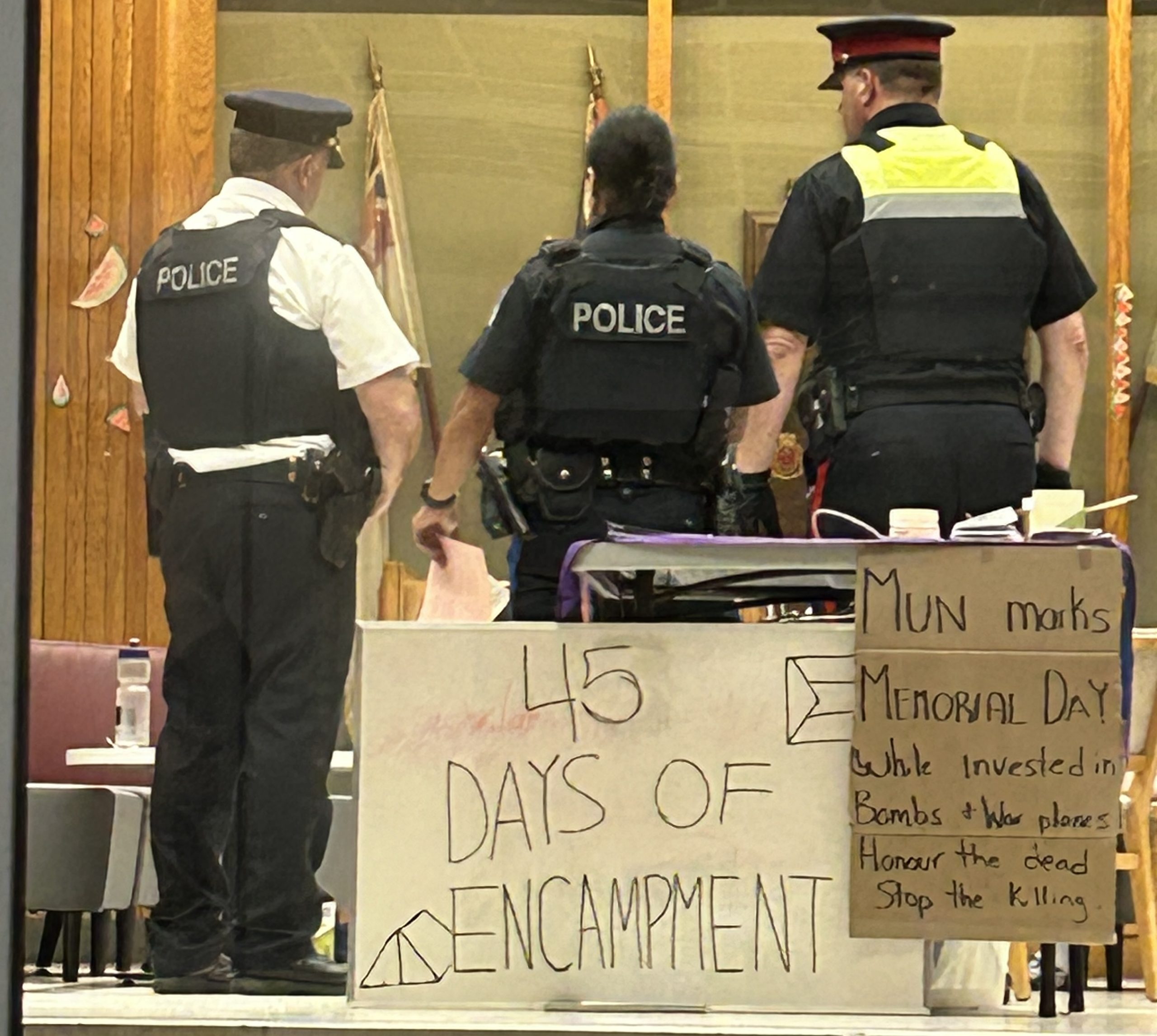 Friday evening began pleasantly, with members of MUN Students For Palestine enjoying an outdoor barbecue. They were aware Memorial had sent employees in the Arts and Administration building home early, and at the barbecue they discussed whether the university’s intent was to use this as an excuse to file for an injunction to remove student protestors from their 45-day occupation of the building’s lobby.