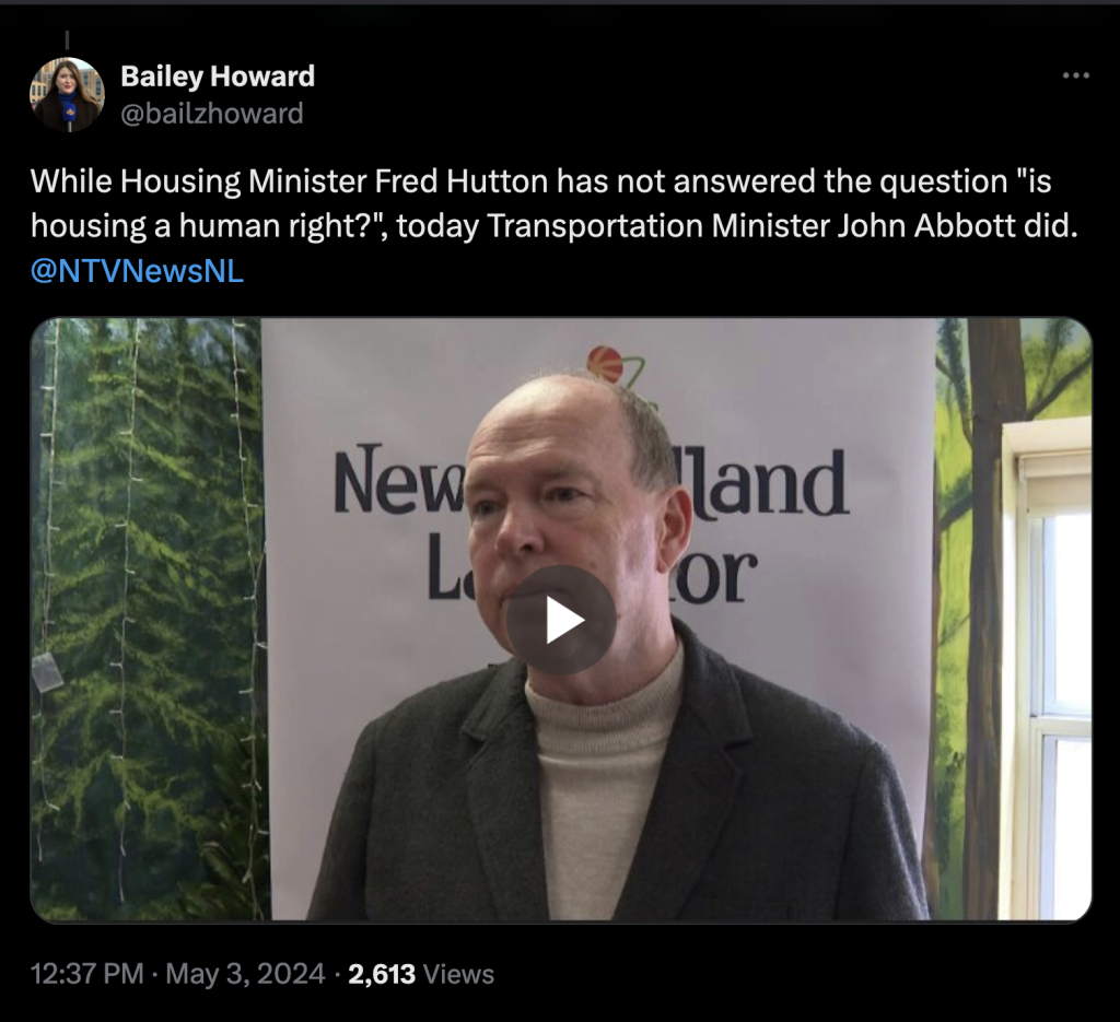 To date, the provincial Liberals have not publicly stated that housing is a human right. The only exception came in May, when then Transportation Minister John Abbott awkwardly admitted to NTV that he shares the federal housing advocate’s view. That only happened when reporter Bailey Howard asked him point blank. “Yes I do,” he replied. “Yep.”