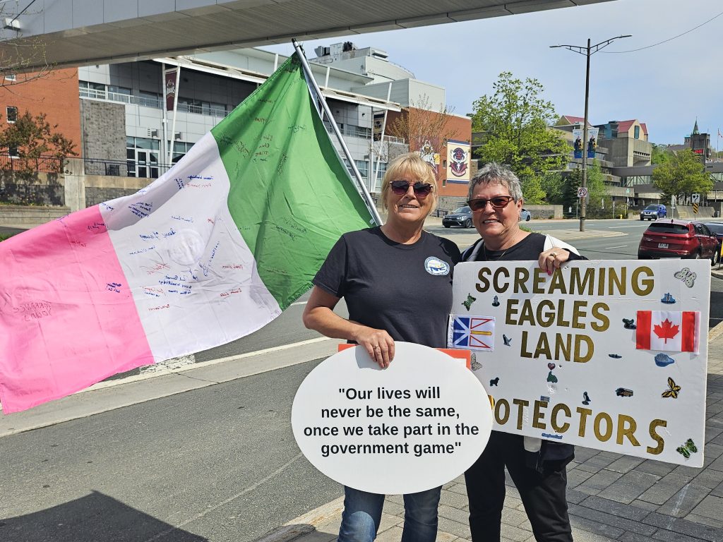 Coreen Turourout (left) and Sandra Woolridge (right) protest outside the Energy NL conference in St. John’s on June 3, 2025. Yumna Iftikhar.