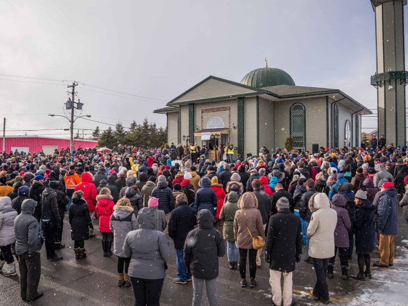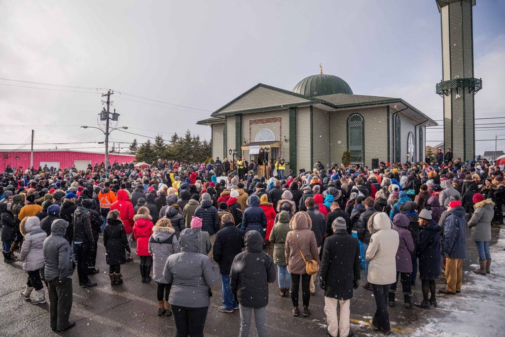 Between 1,000 and 2,000 people gathered outside the Masjid-an-Noor Mosque in St. John’s Friday to form a “human shield” around the building as members of the city’s Muslim community prayed inside.
