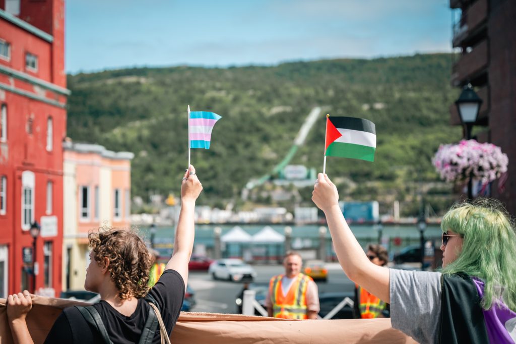 Like the previous week’s Pride Parade, the Trans March was held in partnership with Palestine Action YYT. Following the speeches at Harbourside Park, the boisterous crowd of about 150 marched along Water Street to the Supreme Court building, where they paused for more speeches, including a joint address from two Palestinians living in St. John’s.