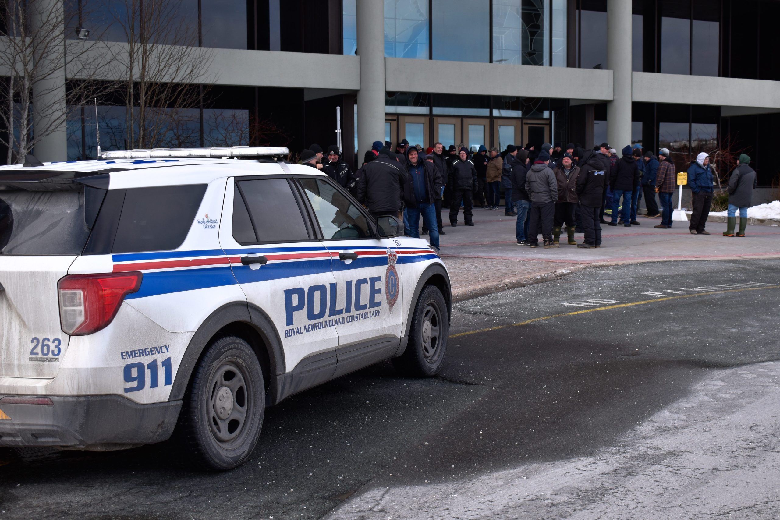 In the afternoon, the Royal Newfoundland Constabulary issued a statement saying two of its horses “were struck by demonstrators which forced the Mounted Unit to retreat,” and that “during one of the ‘rushes’ an officer was injured, and has been sent to hospital for treatment.”